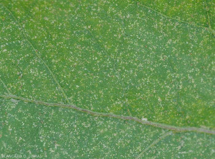 * Las larvas, ninfas y adultos, a menudo presentes en la parte inferior de la lámina de la hoja, se alimentan mordiendo y luego chupando el contenido de las células vegetales y, por lo tanto, son responsables de estos síntomas.