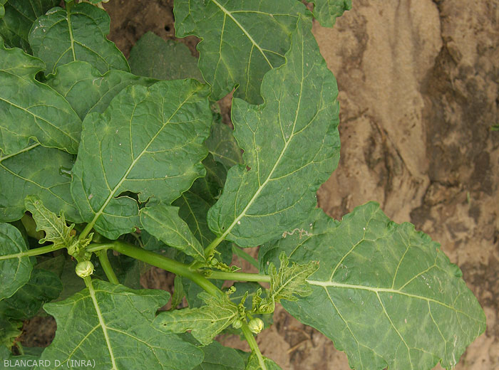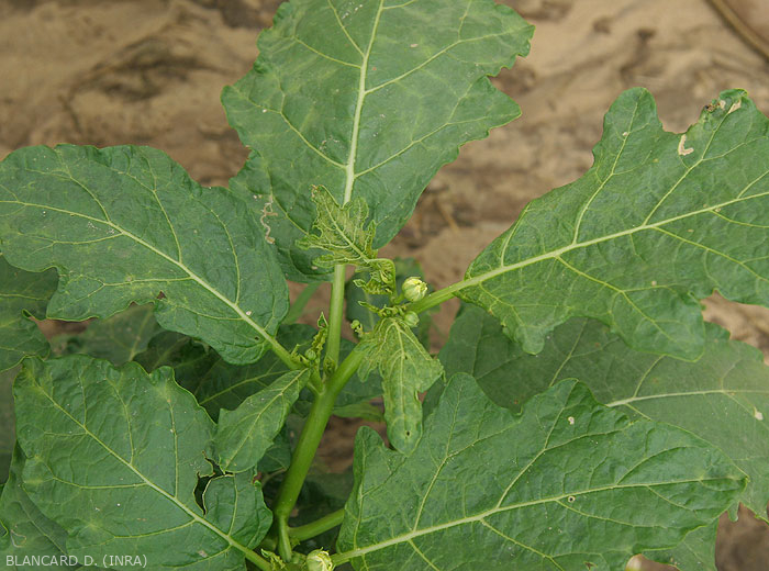 - Enrollamiento de las hojas que también están dobladas, más gruesas y rígidas (figuras 5 - guindilla) (figura 10 - tomate). A veces muestran un tinte de bronce a marrón y su parte inferior tiene reflejos brillantes.