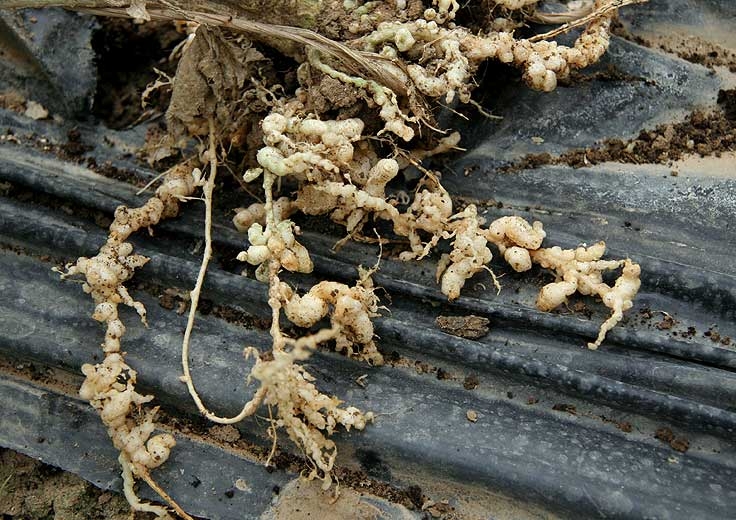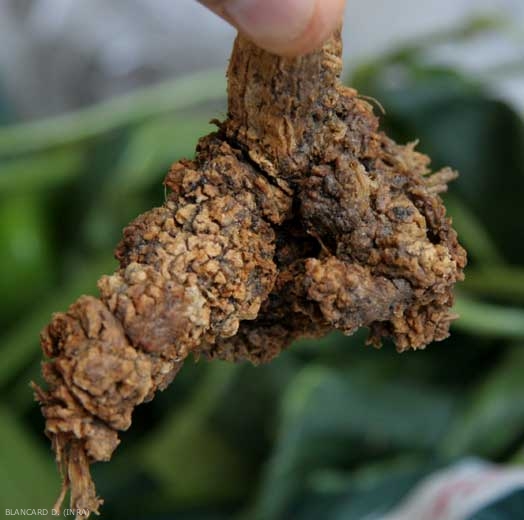 Des galles blanches plus ou moins grosses et régulières caractérisent la présence des nématodes appartenant au genre Meloidogyne spp. sur le système racinaire du melon (figures 1 et 2). Celles-ci brunissent et subérisent progressivement en évoluant , et leur nombre et leur forme dépendent de l'espèce sévissant et du taux d'inoculum du sol.