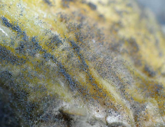 El micelio del hongo invade los tejidos y posteriormente los cubre un moho blanquecino a grisáceo (Figuras 2, 3 y 5). Está formado por micelio, esporocistóforos y esporoquistes de este zigomiceto. A largo plazo, numerosos cuerpos fructíferos bastante aéreos, en "cabezas de alfiler negras", son visibles en los tejidos dañados (figura 6).