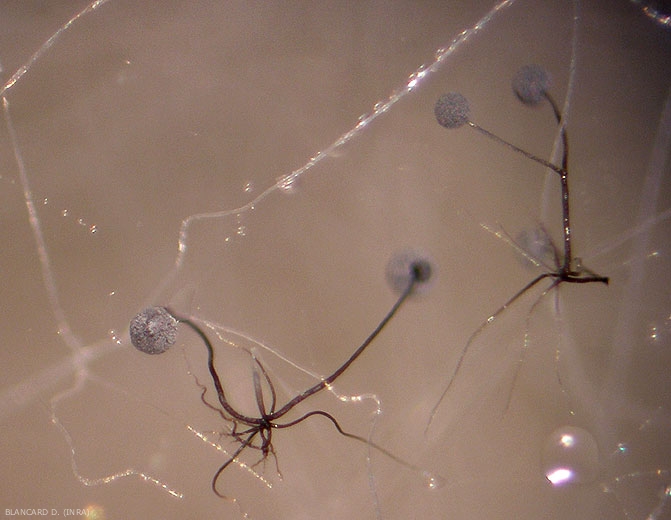 - stolonifer , que evoluciona rápidamente en frutos, pronto esporula en forma de numerosos esporangióforos que albergan innumerables esporas negras en vesículas de esporas (Figuras 8 a 10). Estos están muy presentes en el aire y son dispersados por el viento a grandes distancias, así como por salpicaduras de agua y ciertos insectos.