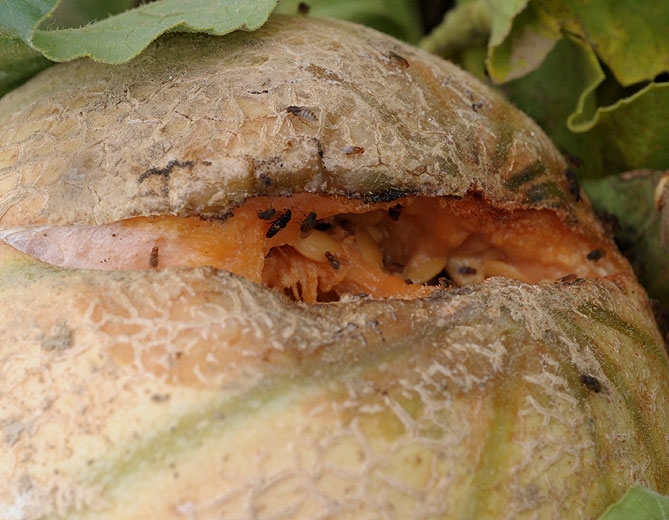 Un ligero olor ácido puede acompañar a estas pudriciones en el melón, así como la presencia de moscas de la fruta (figura 7).