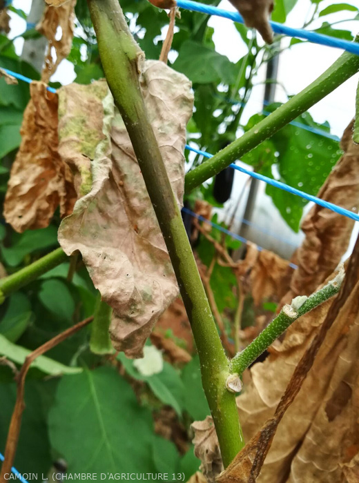 Pardeamiento unilateral del tallo que bordea una cancillería, daño necrótico pardusco visible por varios centímetros de longitud.  <b><i> Fusarium oxysporum </i> f.  sp.  <i> melongenae </i></b>