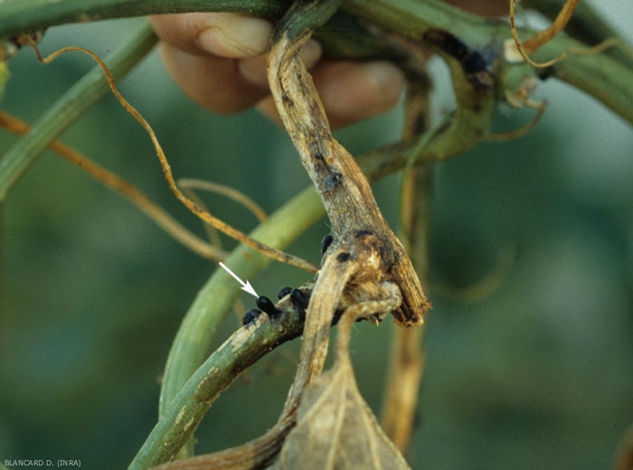 Se han formado picnidios y peritecios de <i> <b> Didymella bryoniae </b> </i> en esta parte del tallo podrido.