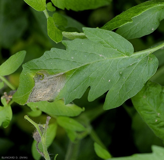 Gran mancha necrótica ubicada al final de un foliolo de tomate y que se extiende gradualmente hacia el interior del limbo. Se ven arabescos concéntricos. <b> <i> Botrytis cinerea </i> </b> (moho gris)
