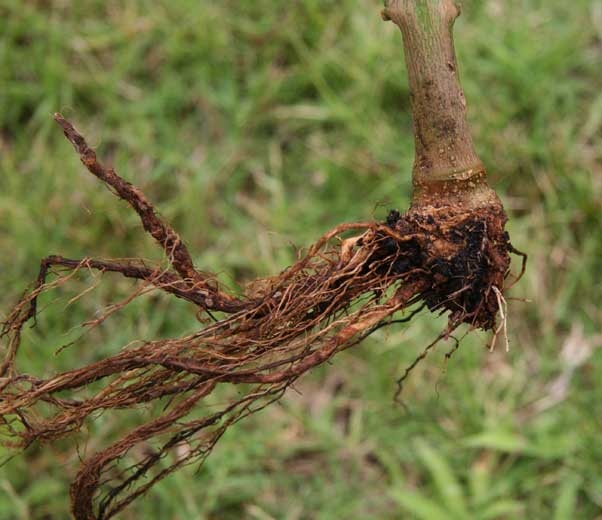- Fontes de semis et chancres noirs et déprimés apparaissant sous les cotylédons, des pourritures racinaires et du collet sur jeunes plantules en pépinière ou après plantation ;