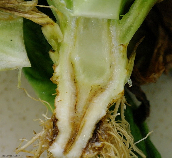 - Brunissement vasculaire plus ou moins marqué des vaisseaux du xylème ;