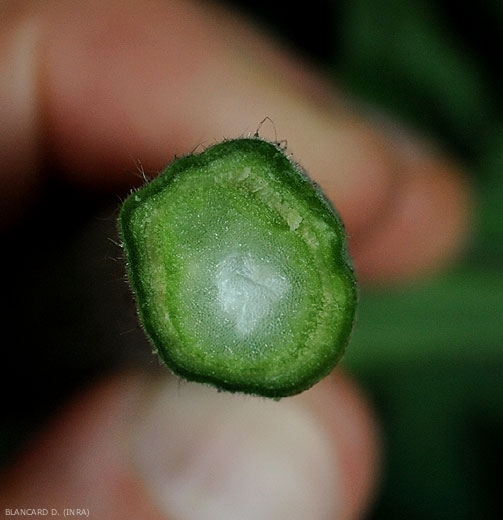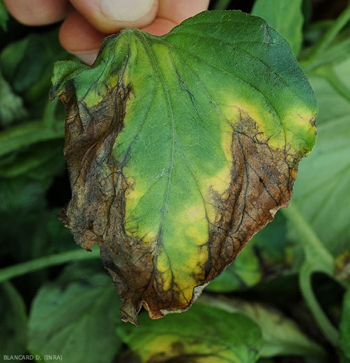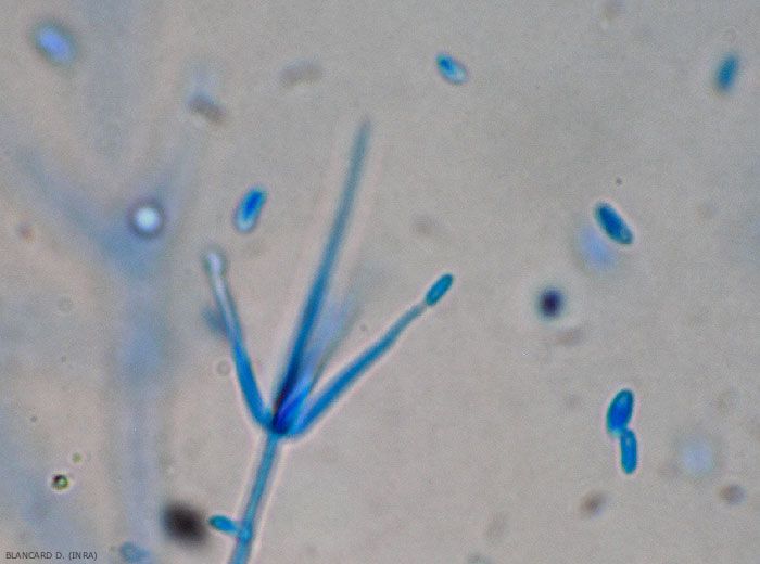 - Les fragiles conidiophores verticillés formant des conidies ovoïdes ne peuvent pas être observés directement sur les échantillons de plantes malades.