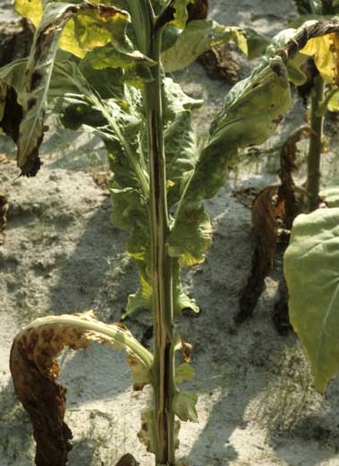 Soulignons que parmi les micro-organismes signalés précédemment, un certain nombre d'entre-eux sont qualifiés de vasculaires (Fusarium oxysporum f. sp. nicotianae, Verticillium dahliae, Ralstonia solanacearum), c'est-à-dire qu'ils sont localisés et qu'ils progressent dans les vaisseaux du tabac. La localisation et la multiplication vasculaire de ces agents pathogènes, les réactions des plantes (nombreuses substances gommeuses sécrétées pour faire barrage), sont aussi à l'origine d'autres symptômes très caractéristiques, comme des flétrissements, des jaunissements et des dessèchements de feuilles, souvent sectoriels (figure 1).