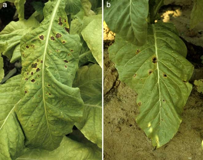 Les taches brunes à noires observées sur feuilles de tabac et exemplifiées ci-dessous, peuvent avoir différentes origines, aussi bien biotiques qu'abiotiques.