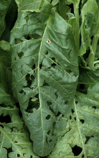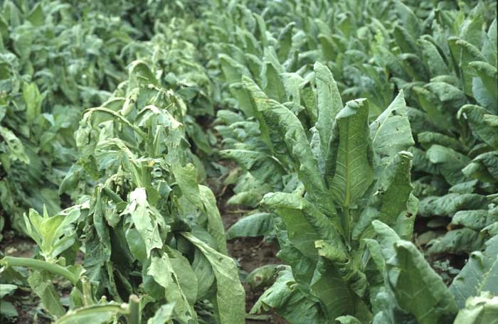 A la suite de pluies importantes, accompagnées de grêle, il n'est pas rare d'observer des dégâts importants dans les cultures de tabac. En effet, la plante de tabac, de par sa morphologie, est particulièrement vulnérable aux grêlons. Ces derniers, en percutant les feuilles, la tige et les inflorescences, occasionnent des trous, des déchirures, des altérations nécrotiques localisées, correspondant à leurs points d'impact (figure 1). Certaines feuilles peuvent être totalement déchiquetées (figure 2).