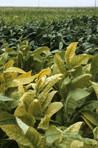En général, le stolbur commence à se manifester dans le courant du mois d'août, à l'approche de la floraison des tabacs. A ce moment de la culture, les tabacs sont écimés et les bourgeons axillaires sont inhibés chimiquement. La maladie se traduit alors par l'apparition de jaunissements d'abord entre les nervures survenant le plus souvent sur les vieilles feuilles ou les feuilles intermédiaires et gagnant progressivement l'ensemble de la plante (figures 1 et 2). Dans le cas des tabacs bruns, des nécroses nervaires et inter-nervaires accompagnent parfois une légère chlorose du limbe ; le syndrome obtenu peut être confondu avec celui provoqué par certaines souches nécrotiques de PVY (figure 3). Par la suite, la décoloration est telle que le limbe devient totalement blanc. Ce symptôme est peut-être à l'origine de ce que les anciens tabaculteurs observaient parfois et dénommaient les "pieds blancs" (figure 4). Cette anomalie de coloration n'est pas le symptôme le plus caractéristique ; par contre, elle a pu être à l'origine de nombreuses confusions avec ceux occasionnés par des désordres nutritionnels.