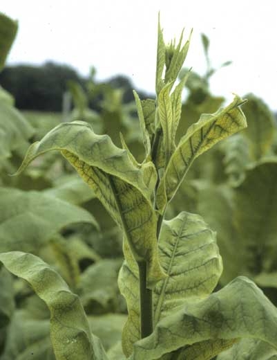 Confrontés à la Polyphyllie (ou "frenching"), les producteurs de tabac observent, aussi bien en pépinière qu'en plein champ, des symptômes assez particuliers affectant essentiellement les feuilles. En premier lieu, ils constatent généralement un jaunissement assez marqué des tissus internervaires. Les nervures au contraire restent bien vertes et contrastent avec le restant du limbe. Par la suite, la croissance des nouvelles feuilles est particulièrement affectée, et donc leur forme. Ces feuilles ne présentent aucun développement radial ; à terme, elles sont très effilées (figure 1), avec la pointe enroulée vers le bas et les bords ondulés (figure 2). Les nombreux bourgeons axillaires se développant sont à l'origine d'une rosette de nombreuses feuilles, petites, étroites et vert pâle (d'où le nom de polyphyllie) et confèrent à la plante un aspect assez caractéristique en balai de sorcière (figure 3).