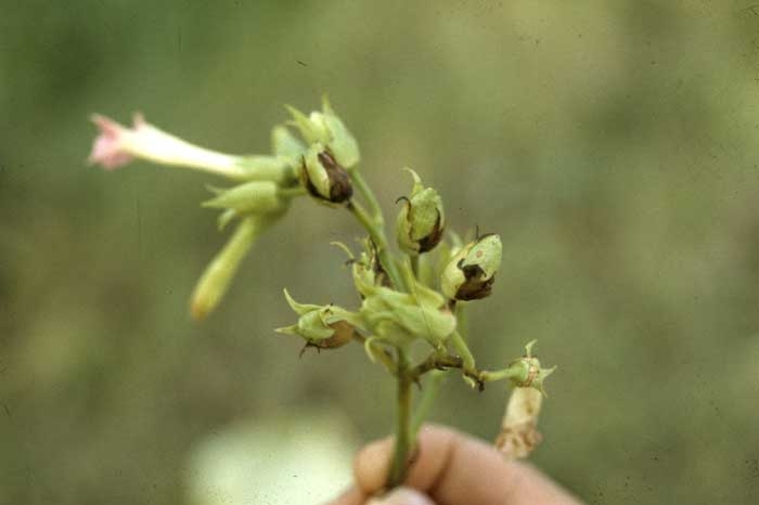 La bactérie Pectobacterium carotovorum subsp. carotovorum (anc. Erwinia carotovora subsp. carotovora) est responsable de larges altérations humides et noires sur feuilles de tabac (figures 1 et 2) . Un halo jaune, du à la toxine émise par la bactérie, peut être observé autour des taches (figure 2). Notons que les pièces florales (figure 3) peuvent être aussi atteintes.