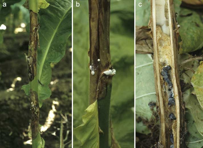 Sur plantule, ce sont surtout ses chancres sur tige qui sont particulièrement dommageables (figure 1). Ce champignon gagne cette dernière après avoir colonisé les cotylédons ou l'une des premières feuilles sénescentes. Les chancres, localisés sur la partie basse de la tige, sont humides et brun clair et ont tendance à se couvrir d'un dense mycélium blanc et de gros sclérotes noirs très caractéristiques. Quelques lésions peuvent évoluer après plantation, si elles n'ont pas été détectées au moment du prélèvement et du triage des plants.