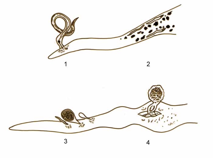 Les nématodes endoparasites migrateurs ("root lesion nematodes", figure 1), en pénétrant dans le cortex de la racine et en détruisant progressivement de nombreuses cellules, induisent d'abondantes lésions brun rougeâtre à noires sur les racines (figures 2 à 4). Celles-ci sont comparables à celles induites par Thielaviopsis basicola, hormis la présence de manchons liégeux sur les racines. Des adultes, des larves et des oeufs sont souvent visibles dans les cellules du cortex (figure 5) ; ils permettent de confirmer votre diagnostic.