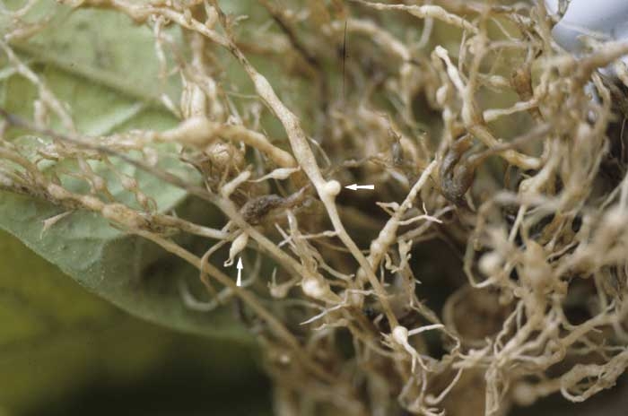 Des galles plus ou moins grosses et régulières sur les racines caractérisent la présence de ces nématodes (figures 1 à 3). La nature et l'importance des galles dépendent de l'espèce et du taux d'inoculum du sol. Les galles produites par Meloidogyne hapla sont plutôt petites et affectent une faible proportion des racines, tandis que celles induites par M. arenaria ont la taille d'une perle et touche la quasi-totalité des racines. Les deux autres espèces majeures entraînent des galles de grande taille couvrant parfois l'ensemble des systèmes racinaires.