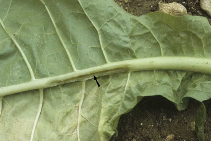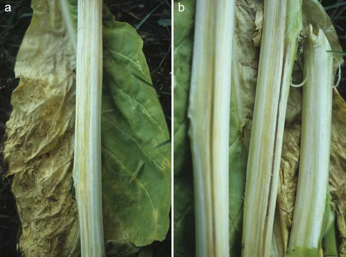 Ce qui caractérise la verticilliose (Verticillium dalhiae), comme d'autres maladies vasculaires, c'est l'apparition de flétrissements et/ou de jaunissements très marqués affectant par secteurs les feuilles basses de pieds de tabac (figures 1 à 3). La répartition de ces symptômes, qui sont qualifiés d'unilatéraux, est due à l'envahissement des vaisseaux du bois par le champignon. Ils surviennent fréquemment à partir de la floraison et durant la récolte. Les tissus du limbe touchés se dessèchent ultérieurement.