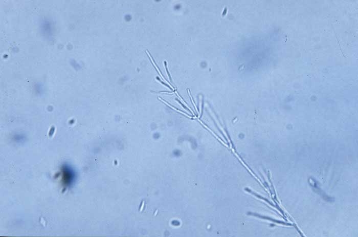 Les contaminations se produisent souvent soit directement, soit à la faveur de diverses blessures racinaires. Elles sont aussi favorisées par les attaques de nématodes à galles et de Pratylenchus spp. (voir Les différents types de nématodes des racines). Une fois en place, ce champignon gagne le système vasculaire des plantes, qu'il colonise progressivement. Celles-ci réagissent à cet envahissement vasculaire en formant de la gomme ou des thylles empêchant sa progression, qui contribuent à les faire flétrir. Par la suite, il y produit des microsclérotes et de fragiles conidiophores verticillés formant des conidies ovoïdes (figure 2).