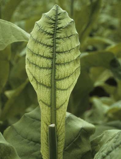 Confrontés à la Polyphyllie (ou "frenching"), les producteurs de tabac observent, aussi bien en pépinière qu'en plein champ, des symptômes assez particuliers affectant essentiellement les feuilles. En premier lieu, ils constatent généralement un jaunissement assez marqué des tissus internervaires (figures 1 et 2). Les nervures au contraire restent bien vertes et contrastent avec le restant du limbe (figure 3). Par la suite, la croissance des nouvelles feuilles est particulièrement affectée, et donc leur forme. Ces feuilles ne présentent aucun développement radial ; à terme, elles sont très effilées (figure 4), avec la pointe enroulée vers le bas et les bords ondulés (figure 2). Les nombreux bourgeons axillaires se développant sont à l'origine d'une rosette de feuilles nombreuses, petites, étroites et vert pâle (d'où le nom de polyphyllie) et confèrent à la plante un aspect assez caractéristique en balai de sorcière (figure 5).