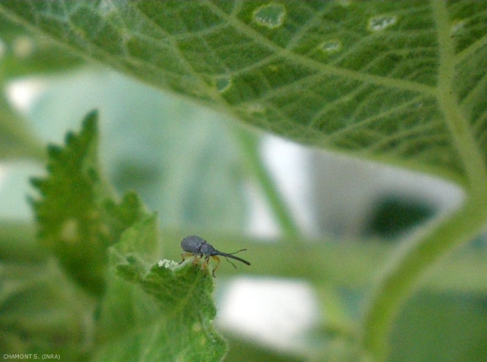 Souvent observé sur rose trémière (Alcea rosea, Malavaceae), on trouve Rhopalapion longirostre qui est la cause d'une multitude de trous sur les feuilles (figure).