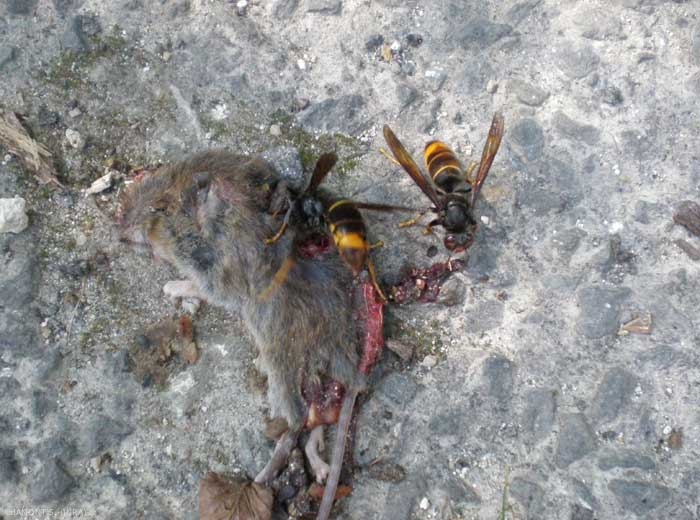 Leur alimentation comporte ainsi de la viande, du nectar et de la pulpe de fruit mûr (figures). Vespula germanica est à ce titre un ravageur notable, de même que le frelon (Vespa crabro).