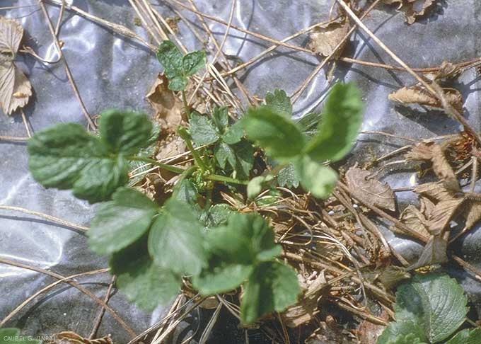 Sur fraisier (figure 1), le plant est rabougri et peu vigoureux. Les jeunes feuilles sont réduites, déformées et rougeâtres. Les folioles restent plus longtemps repliées que sur les plantes saines ; elles sont tordues, gaufrées et marquées de plages gris noirâtre à l'endroit où les anguillules se sont nourries avant de migrer sur des feuilles plus jeunes. Les stolons restent courts. Les fruits sont rares et déformés.