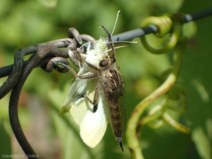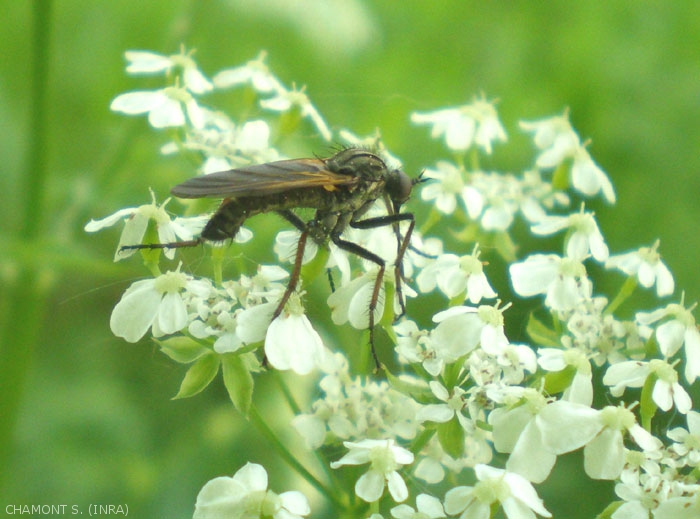 Par exemple, chez les Asilidae (mouches à toison, figure), les adultes sont munis d'une trompe rigide leur permettant de transpercer leurs proies et d'y injecter la salive puis d'aspirer le contenu prédigéré. Ce sont des prédateurs de lépidoptères (---> plus d'infos). D'autres familles de diptères comme celles des Mydidae, Therevidae, Dolichopodidae, Empididae (dance flies, figure) et Sciomyzidae comprennent des espèces entomophages.