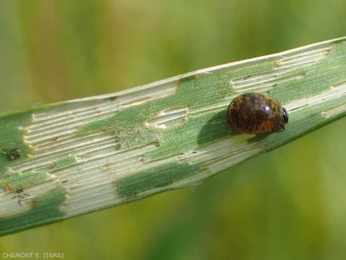 Après avoir quitté son abri au printemps, l'adulte pratique des morsures de maturation d'abord sur les graminées sauvages puis, plus tard, en mai, sur le jeune blé. Comme Oulema gallaeciana, ces morsures des adultes provoquent des dégâts caractéristiques "en carreaux de fenêtre" qui sont aussi le fait des larves sur le dessus des feuilles de céréales (figure 3).