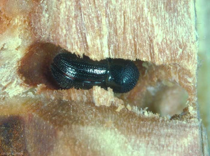Le xylébore attaque les arbres en bon état sanitaire. La galerie de pénétration de la femelle est perpendiculaire à l'axe de la branche, puis bifurque pour former, dans les grosses branches, un anneau concentrique. A partir de cet anneau, sont creusées de courtes galeries parallèles à l'axe de la branche. Le forage des galeries (figures 2 et 3) entraîne souvent la mort des jeunes sujets et un dépérissement rapide des arbres âgés qui se dessèchent brusquement après la floraison. Chez les arbres vigoureux, la sève inonde les galeries et peut entraver le développement des oeufs et des larves.