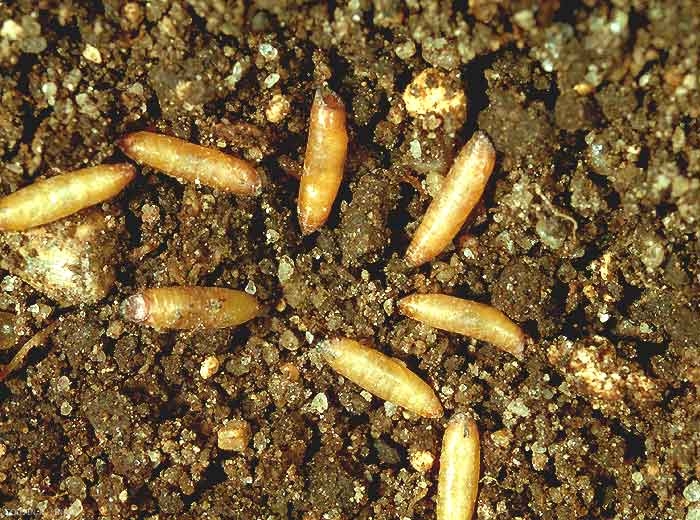 Les oeufs sont très petits, peu visibles, cachés dans le sol, isolés ou groupés en tas. L'asticot est très allongé (6 à 7 mm), blanc jaunâtre brillant. La pupe est brunâtre en forme de tonnelet (figure 2).