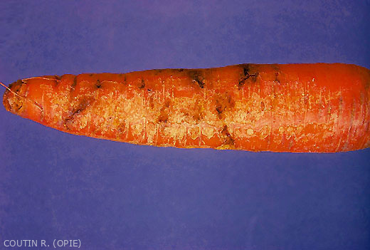 Les larves creusent des galeries sinueuses dans les racines . Les carottes attaquées ont alors une croissance ralentie ; elles sont souvent envahies par la pourriture et prennent un goût amer (figure 3). Lorsque les larves hivernent dans la racine, les dégâts sont amplifiés (figure 4).