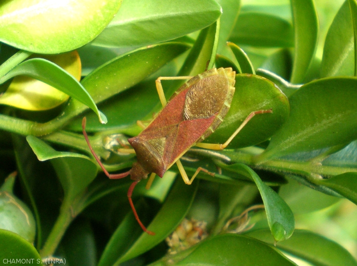 Parmi celles-ci on trouve Gonocerus acuteangulatus, la punaise du prunellier (figure) dont le buis est souvent cité comme hôte habituel, mais qui peut faire des dégâts sur fruits, prune ou pêche (photo). La corée marginée, Coreus marginatus, (Linnaeus, 1758) est appelée aussi punaise de la courge. Rencontrée fréquemment sur les Polygonaceae, elle se nourrit de fruits ou de graines et peut s'attaquer aux cucurbitacées, en causant quelques dommages par ses piqures nutriciales.