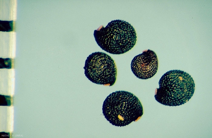 Forme : réniforme à bord caréné, avec appendice celluleux au niveau du hile ;