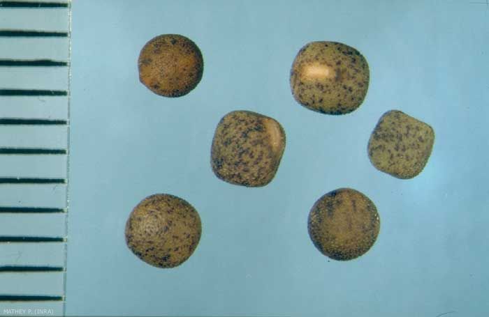 Fruits très allongés, plus ou moins couverts de poils, à nervures disposées en long et devenant jaunâtres à la maturité. Semences sphériques plus ou moins anguleuses, verruqueuses rudes, à taches sombres.