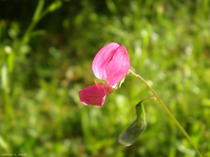 Fleurs rougeâtres ou roses assez petites (8 à 10 mm de longueur) solitaires ou par 2 sur des rameaux florifères très grêles, plus courts que la feuille. Étendard à veines sombres, carêne blanchâtre (8 à 9 mm de long) ;