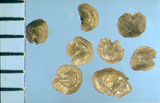 Forme : semence aplatie, à contour arrondi, légèrement réniforme, à large disque équatorial festonné, lisse ou à peine verruqueux ;