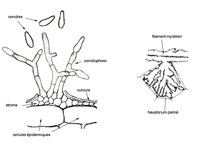 A ce stade, V. inaequalis produit sur son mycélium des conidiophores. Ceux-ci apparaissent de part et d'autre du limbe et sont groupés en faisceau. Ils sont courts, simples, amincis au sommet et ont une paroi lisse, de couleur brun olive (figure 1).