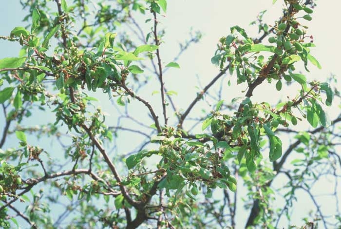 Sous l'action des piqûres des fondatrices et de leur descendance, les feuilles du prunier se crispent très fortement, s'enroulent et s'appliquent le long de la tige (figures 1 et 2). Sur le tournesol, les pucerons se localisent sur les feuilles qui se crispent. Ils gagnent ensuite les capitules et forment des colonies denses entre les graines. Sur l'artichaut, les bractées rougissent et durcissent. Par ailleurs, ce puceron est l'un des vecteurs du virus de la sharka (PPV, Plum pox virus), virus très redouté dans les vergers.