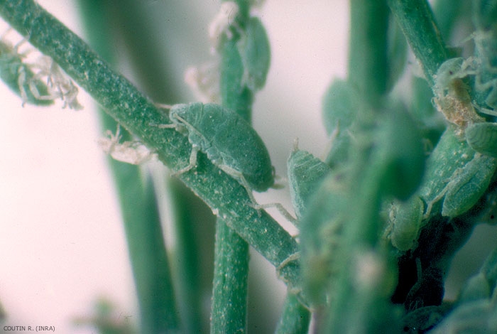 Seules les tiges des pieds attaqués sont affaiblies (toxémie), déréglées dans leur croissance, rabougries, formant comme des balais de sorcière ; les plants prennent un aspect buissonnant. Ceci entraîne l'année suivante un nanisme des pieds, les turions dont le calibre est plus faible perdent une partie de leur valeur commerciale. Les pieds deviennent très sensibles aux contaminations du champignon Gibberella fujikuroi (anam. Fusarium moniliforme), responsable du dépérissement rapide des plantes qui doivent alors être arrachées.