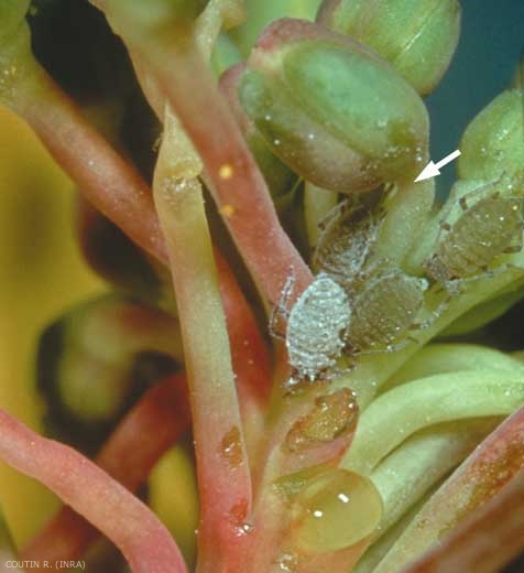 En cas de pullulation, la plante peut être entièrement recouverte par les pucerons, leur miellat et leurs exuvies (figure 2). Les choux ou colza ainsi attaqués se développent mal et dépérissent (figure 3). Les feuilles centrales se recroquevillent et se décolorent. Sous l'action des piqûres, les hampes florales se déforment et les fleurs avortent (figure 4).