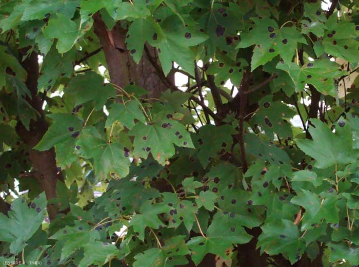Parmi les différents pathogènes pouvant atteindre l'érable, on trouve plus particulièrement des champignons aériens tels que Rhytisma acerinum responsable de la maladie des taches noires (figure 1) ; l'oïdium provoqué par deux pathogènes, Sawadaea bicornis et S. tulasnei (anc. Uncinula aceris) ; la grave maladie du corail qui induit un dépérissement de l'arbre étant provoquée par Nectria cinnabarina (Ascomycota Sordariomycetes, figure 2). On peut citer encore Cryptostroma corticale (Ascomycota, Pezizomycotina) responsable de la maladie de la suie.