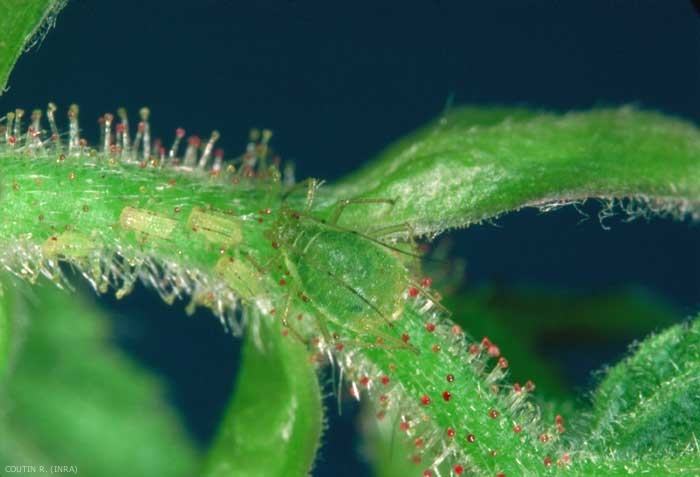 L'adulte mesure environ 1,5 mm, il est de forme globuleuse et de couleur vert pâle à légèrement rosé. Sa coloration fort voisine de celle des organes de la plante (ramilles et pétioles) rend difficile le dépistage précoce de sa présence (figure 1).