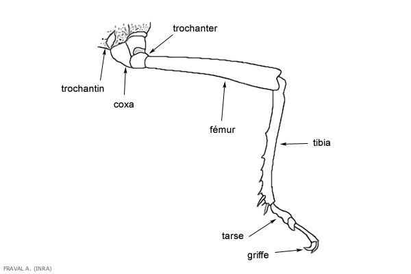 - fémur (figure 2) : chez les insectes, segment de la patte entre le trochanter (partie de la hanche) et le tibia. Le fémur des pattes sauteuses des orthoptères (criquets et sauterelles) et des altises est renflé. Chez les acariens, un article supplémentaire, le genou, se situe entre le fémur et le tibia.