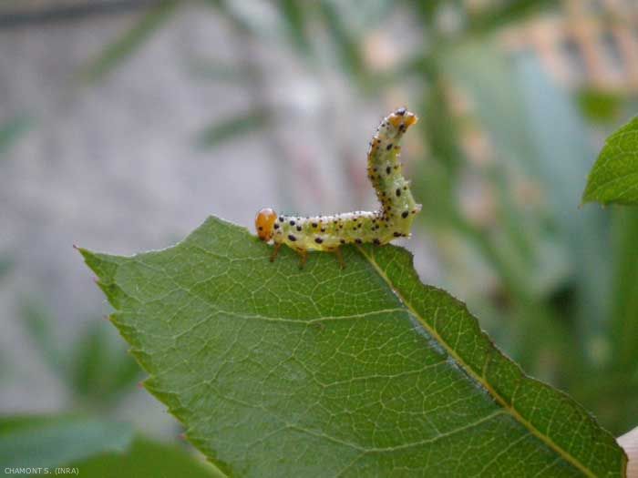 - fausse chenille (figue 1) : larve des hyménoptères symphytes, ou mouches à scie, ou tenthrèdes (Cephidae, Tenthredinidae, Siricidae, Pamphiliidae). Ces larves ressemblent à des chenilles avec, généralement, un nombre de fausses-pattes supérieur à 5 paires.