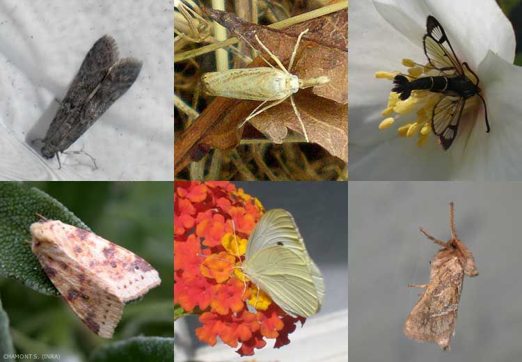 - papillon (figure 2) : adulte (imago) des lépidoptères. Le corps et les 4 ailes sont recouverts de fines écailles. Les pièces buccales, suceuses, en trompe, sont adaptées à la prise d'aliments liquides. Les papillons ne constituent pas le stade nuisible chez les lépidoptères ; mais leur détection avant la période de ponte des femelles par piège lumineux ou piège sexuel appâté avec une phéromone est essentielle pour la conduite d'une lutte raisonnée.