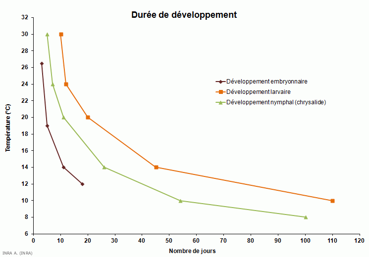 Le développement larvaire passe par 6 stades différents. L'optimum du développement larvaire se situe entre 24 et 30°C. En règle générale, les températures élevées réduisent la durée du cycle larvaire et inversement lorsque les températures sont fraîches (figure 2). En plein champ, les larves effectuent leur cycle en 20-25 jours en été. En serre, ce dernier peut être réduit de moitié et se rapprocher des conditions expérimentales de laboratoire et ce, d'autant plus si la nourriture est de qualité et abondante.