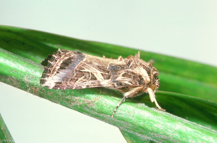 L'adulte est un papillon dont l'envergure est de 3,5 à 4 cm. Ses ailes antérieures sont brunâtres avec des reflets violacés et du jaune paille le long de la nervure médiane (figure 1) ; l'ocelle est marquée de 2 ou 3 rayures obliques blanchâtres. A l'extrémité de l'aile, vers l'arrière, on peut observer une tache noirâtre, plus nette chez le mâle. Les ailes postérieures sont blanchâtres, avec le bord antérieur brun.