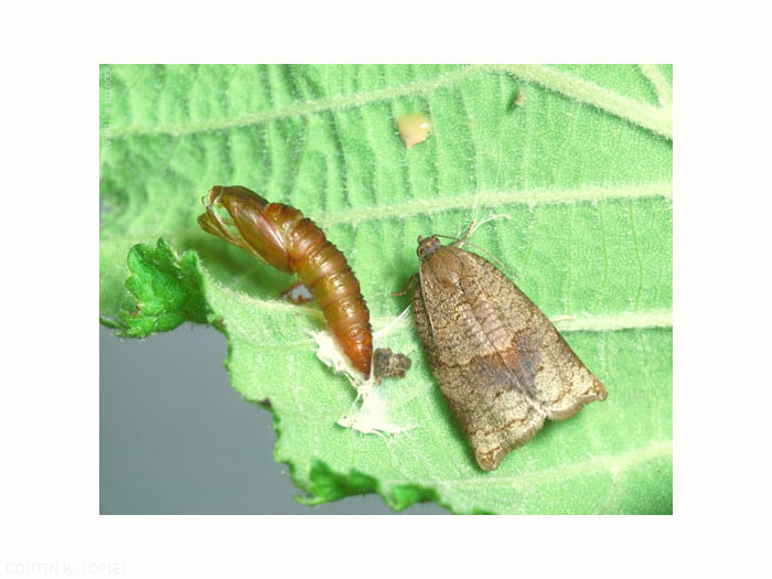 L'adulte mesure de 20 à 25 mm d'envergure (figure 1). La femelle a les ailes antérieures marron pâle avec une bande marron foncé à l'extrémité et une tache sombre médiane accolée au bord postérieur.