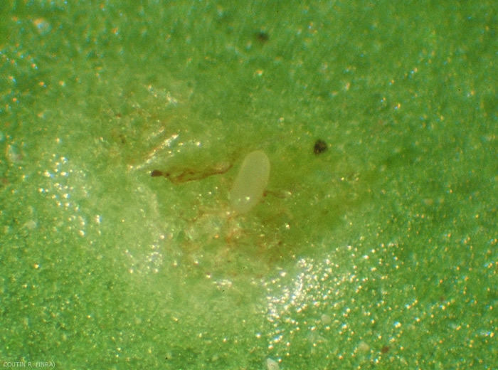L'adulte se déplace peu. Pour se nourrir, la femelle perfore l'épiderme de la feuille avec son ovipositeur puis suce le liquide qui s'en écoule ; le mâle profite des piqûres faites par les femelles. La femelle introduit ses oeufs isolément dans le parenchyme des feuilles (figure1).